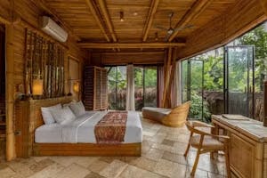 Indulge in the epitome of comfort and luxury with a spacious master bedroom featuring a plush king-size bed, complete with both air conditioning and a ceiling fan. Immerse yourself in nature's embrace with the option for an outdoor shower or luxuriate in a stunning carved rock bathtub, surrounded by the lush greenery. Additionally, enjoy the convenience of a generously-sized indoor bathroom boasting a beautiful bamboo shower for your ultimate relaxation